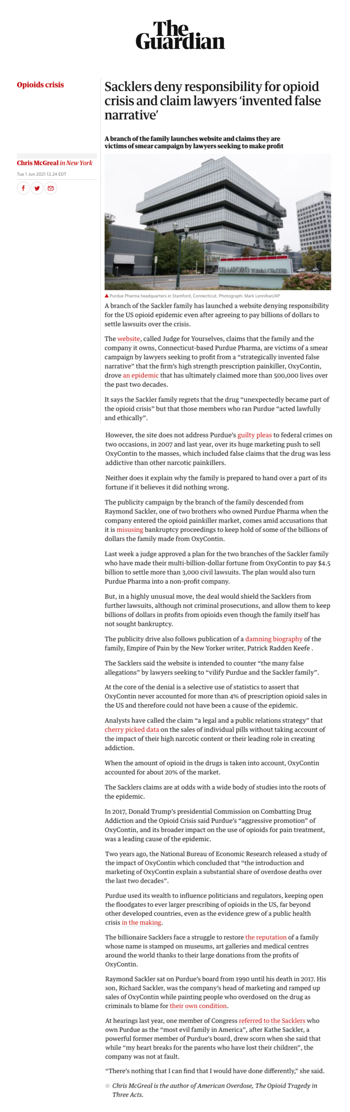 “However, the site does not address Purdue’s guilty pleas to federal crimes on two occasions, in 2007 and last year…”